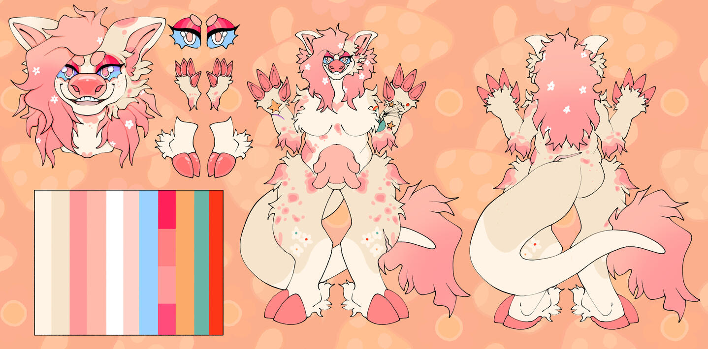 Meet Aiglentine: my main fursona! She is a flower-power jersey cow! She means a lot to me, as she is my very first fursona. She was a custom by another artist, and this ref was done by