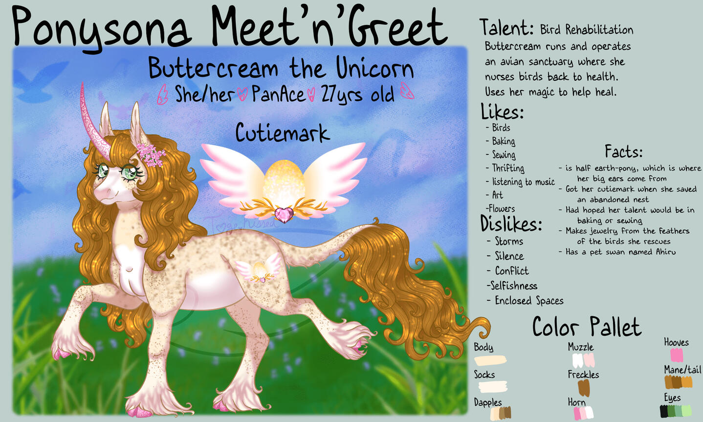 I have a good handful of sonas who mean a lot to me and represent different aspects of myself! My most used are my ponysonas: Buttercream and Floralei! My fursonas are very special as well; I don't draw them but I love commissioning art of them!